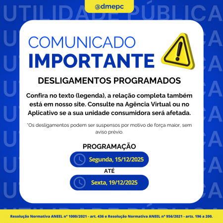 Acesse: Atendimento >> Agência Virtual >> Desligamentos Programados ou https://www2.dmepc.com.br/AgenciaVirtual/ServicosComplementares/DesligamentosProgramados